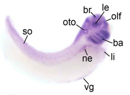 nop14 (NOP14 nucleolar protein) gene expression in Xenopus laevis embryo, assayed via in situ hybridization, NF stage 32, lateral view, anterior right, dorsal up. This image is extracted from figure published in: Grant PA et al. (2014), Image published in: Grant PA et al. (2014) Copyright © 2014. Image reproduced with permission of the Publisher.
