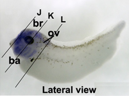 h2ax (H2A.X variant histone) gene expression in Xenopus tropicalis embryo, assayed via in situ hybridization, NF stage 34, lateral view, anterior left, dorsal up. This image is extracted from figure published in: Lee SY et al. (2010), Image published in: Lee SY et al. (2010) Copyright © 2010. Image reproduced with permission of the Publisher and the copyright holder. This is an Open Access article distributed under the terms of the Creative Commons Attribution License.