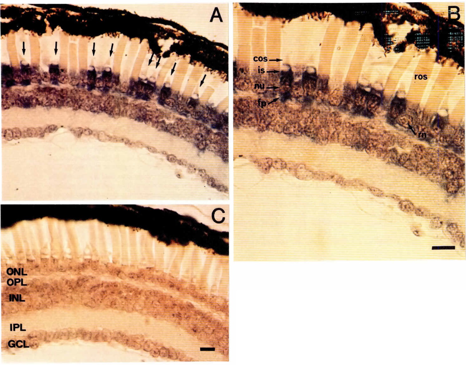 to the stained cones. (BI Enlargement of panelA. Cos: cone outer segment;