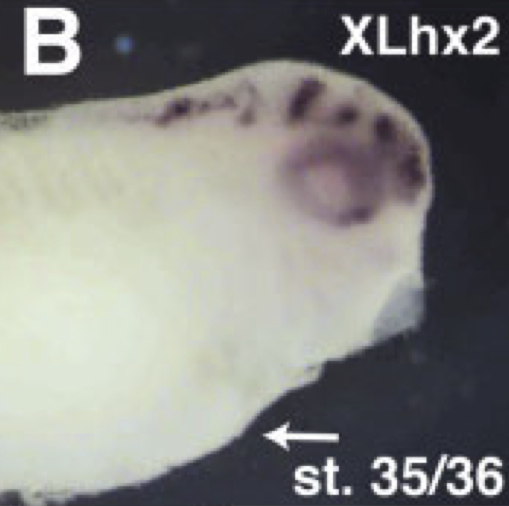lhx2 (LIM homeobox 2 ) gene expression in Xenopus laevis embryo, assayed via in situ hybridization, NF stage 35 & 36, head region only, lateral view, anterior right, dorsal up. This image is extracted from figure published in: Viczian AS et al. (2006), Image published in: Viczian AS et al. (2006) Copyright © 2006. Image reproduced with permission of the Publisher, John Wiley & Sons.
