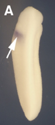 nodal1 (nodal homolog 1) gene expression in Xenopus laevis embryo, assayed via in situ hybridization, NF stage 27, dorsal view, anterior up. Image published in: Onuma Y et al. (2006) Copyright © 2006. Image reproduced with permission of the Publisher and the copyright holder. This is an Open Access article distributed under the terms of the Creative Commons Attribution License.
