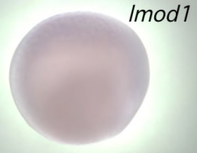 lmod1 (leiomodin 1 (smooth muscle)) gene expression in Xenopus laevis embryo, assayed via in situ hybridization, NF stage 15, lateral view, anterior left, dorsal up. This image is extracted from figure published in: Nworu CU et al. (2015), Image published in: Nworu CU et al. (2015) Copyright © 2015. Image reproduced with permission of the Publisher, The Company of Biologists Ltd.