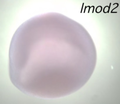 lmod2 (leiomodin 2 (cardiac)) gene expression in Xenopus laevis embryo, assayed via in situ hybridization, NF stage 15, lateral view, anterior left, dorsal up. This image is extracted from figure published in: Nworu CU et al. (2015), Image published in: Nworu CU et al. (2015) Copyright © 2015. Image reproduced with permission of the Publisher, The Company of Biologists Ltd.