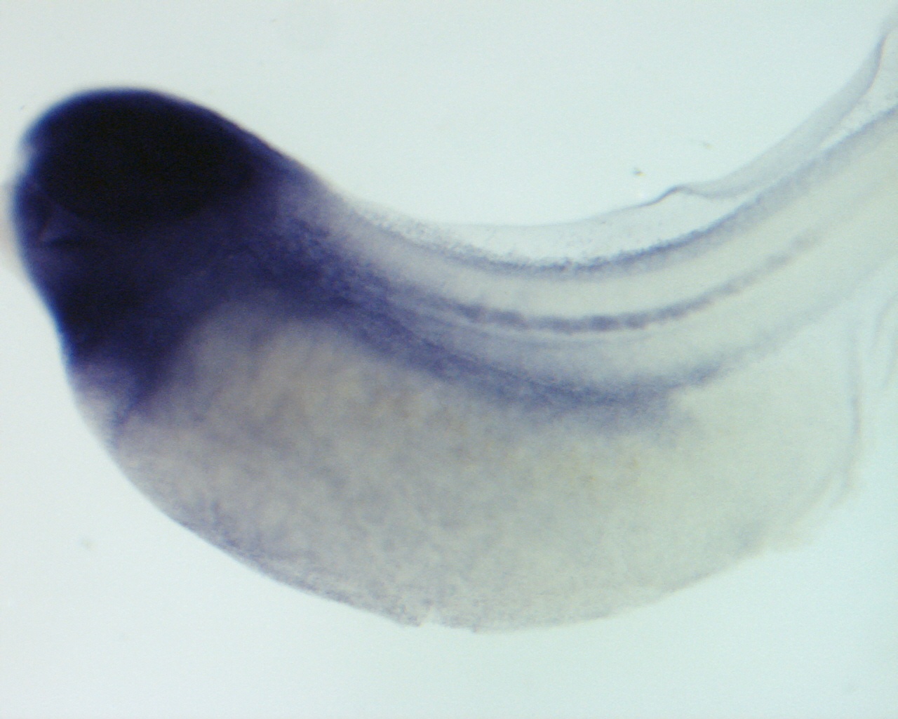 snrk (SNF related kinase) gene expression in Xenopus tropicalis embryo, assayed via in situ hybridization, NF stage 39, lateral view, anterior left, dorsal up. Copyright © Patient Lab Image created by: Aldo Ciau-Uitz