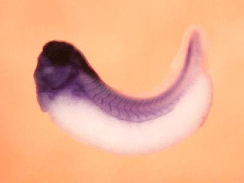 hipk2 (homeodomain interacting protein kinase 2) gene expression in Xenopus laevis embryo, assayed via in situ hybridization, NF stage 36, lateral view, anterior left, dorsal up. Copyright © Patient Lab Image created by: Aldo Ciau-Uitz