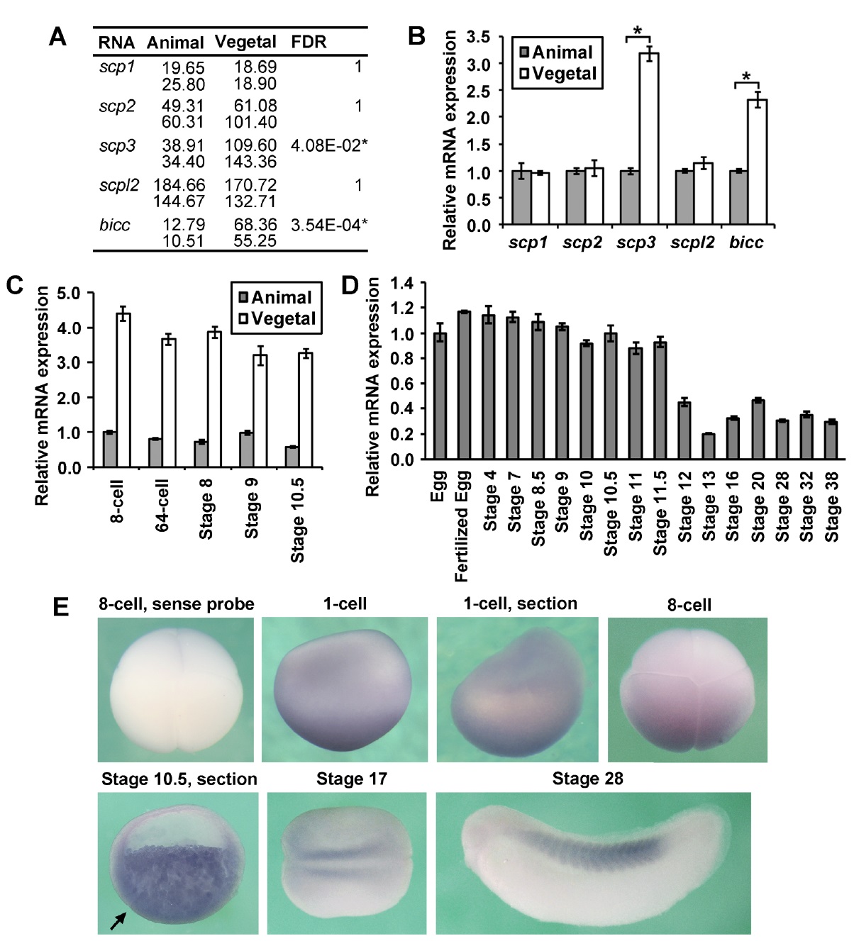 FIGURE 1. Expression pattern of scp3 in Xenopus. (A-B) At 8-cell stage, total mRNA from animal and vegetal blastomeres was extracted respectively and analyzed by RNA-seq (A) or qPCR (B). The numbers in (A) indicate the RPKM (reads per kilobase per million mapped reads) of sequencing in two independent experiments (54). Vegetal enriched transcripts bicc was used as a control. Asterisk indicates significantly different (A, FDR<0.05; B, P-value<0.05) between animal and vegetal samples. (C) At indicated stages, RNA from animal and vegetal cells was extracted respectively and the relative mRNA abundance of scp3 was analyzed by qPCR. (D) qPCR shows the temporal expression pattern of scp3. (E) Expression profile of scp3 verified by in situ hybridization. The embryos at 1-cell to stage 10.5 were shown in lateral view. Stage 17 embryo was shown in dorsal view with the anterior end towards the left side. Stage 28 embryo was shown in lateral view with its head towards the left. The arrow indicates the dorsal lip. Image published in: Sun G et al. (2015) Copyright © 2015. Image reproduced with permission of the Publisher and the copyright holder. This is an Open Access article distributed under the terms of the Creative Commons Attribution License.