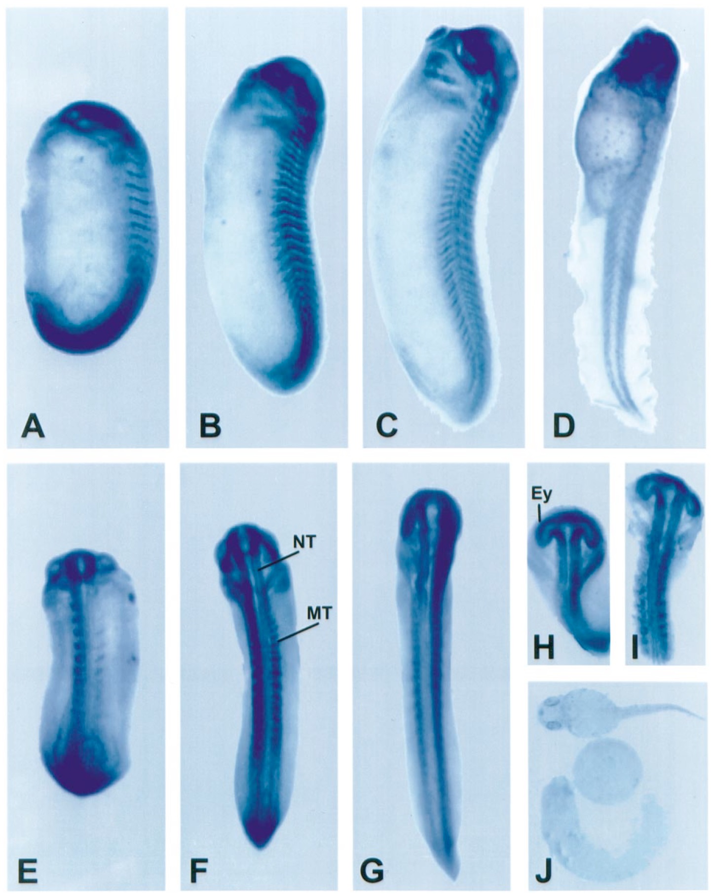 FIG. 3. Localization of MuSK mRNA by whole-mount in situ hybridization. (A–I) Anti-sense probe, (J) sense probe as control. (A–D) Lateral view: (A) stage 22, (B) stage 25, (C) stage 28, (D) stage 45. MuSK mRNA was localized in the myotomes as well as in the CNS in embryos during different stages of myotomal NMJ formation (A–C). After this period, mRNA expression is down-regulated in the myotomal musculature (D). (E–I) Dorsal view: (E) stage 22, (F) stage 28, (G) stage 40, (H, I) dorsal part of the embryo only. In this view, the expression of the MuSK mRNA in both neural tube (NT) and myotomes (MT) is clearly seen. Within the CNS, the eye vesicle is a prominent site of mRNA expression. No labelling was seen at all stages when the embryos were labelled with the sense probe (J).