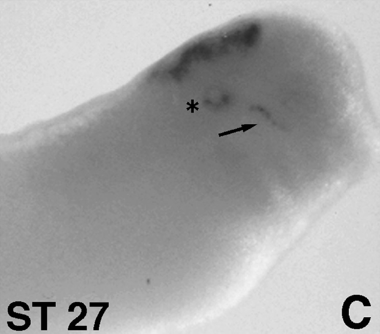 atoh1 (atonal bHLH transcription factor 1) gene expression in Xenopus laevis embryo, assayed via in situ hybridization, NF stage 27, lateral view, anterior right, dorsal up. This image is extracted from figure published in: Kim P et al. (1997), Image published in: Kim P et al. (1997) Copyright © 1997. Image reproduced with permission of the Publisher, Elsevier B. V.