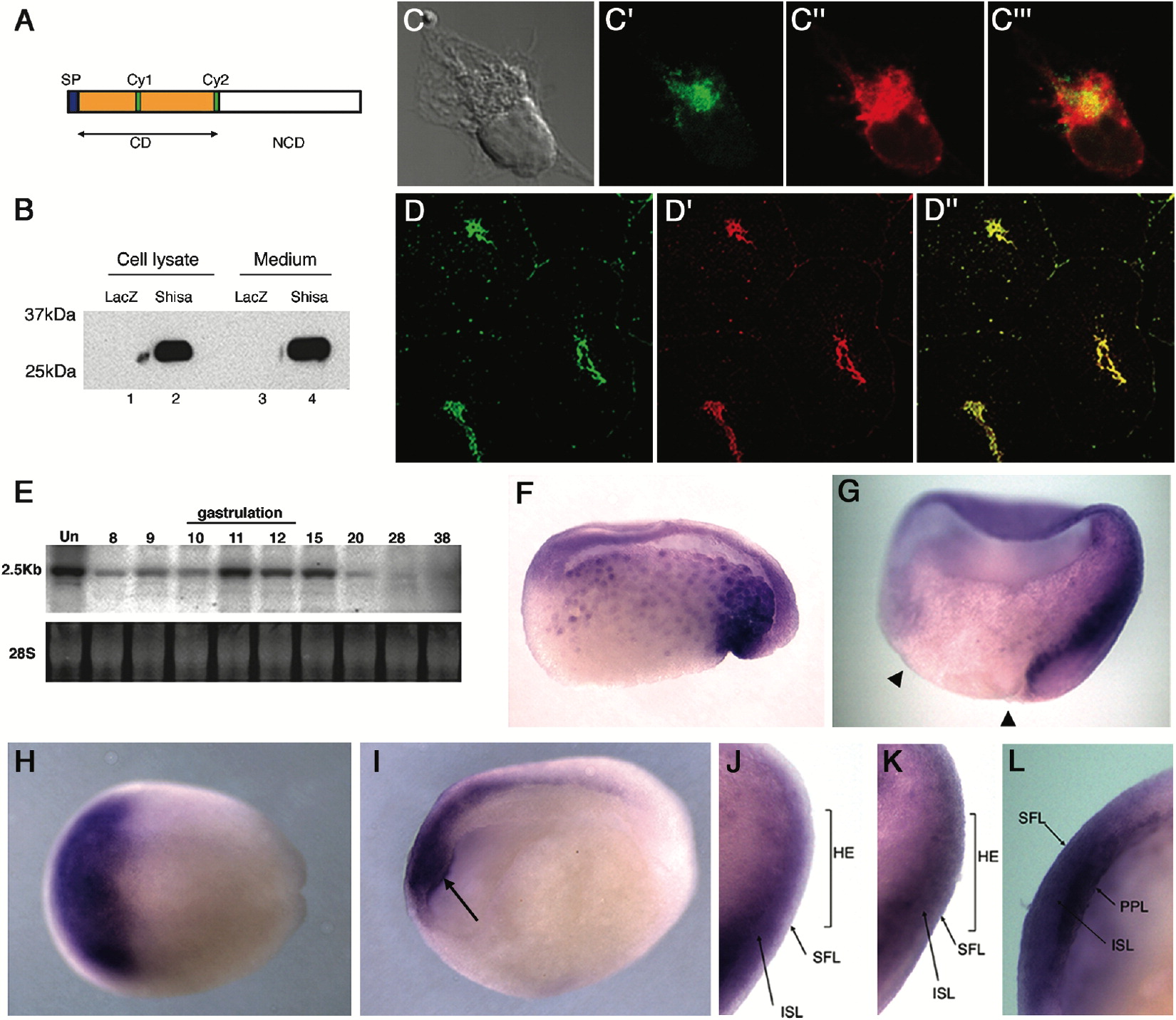 (FâL) Whole-mount in situ hybridization of shisa transcripts. (F, G, J, and K) Sagitally sectioned embryos of stage 10.5 (F) and stage 11.5 (G, J, and K). shisa expression was found in the Spemann organizer of the early gastrulae. In the prospective head ectoderm at mid-gastrula (stage 11.5, according to the developmental time schedule), 55% of the embryos displayed predominant shisa mRNA expression in the internal sensorial layer (ISL in [J]), while 45% had the expression in both superficial layer (SFL) and ISL (K, n = 30). This may be due to slight differences in the developmental stage of each embryo. Arrowheads in (G) indicate blastoderm margin. HE: head ectoderm. (H and L) Dorsal view (H) and sagittally sectioned embryos (L) at the end of gastrulation (stage 13), showing that shisa expression covered the anterior head ectoderm (H) of both ISL and SFL (L). PPL: prechordal plate.