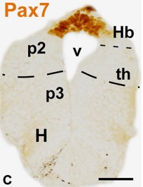 pax7 (paired box 7) gene expression in Xenopus laevis embryo, assayed via in situ hybridization, NF stage 40 &41, transverse section through thalmic area of forebrain, dorsal up.