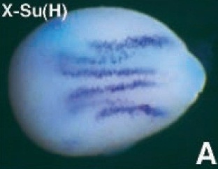 rbpj (recombination signal binding protein for immunoglobulin kappa J region) gene expression in Xenopus laevis embryo, assayed via in situ hybridization, NF stage 15/16, dorsal view, anterior left. Image published in: Wettstein DA et al. (1997) Copyright © 1997. Image reproduced with permission of the Publisher and the copyright holder. This is an Open Access article distributed under the terms of the Creative Commons Attribution License.