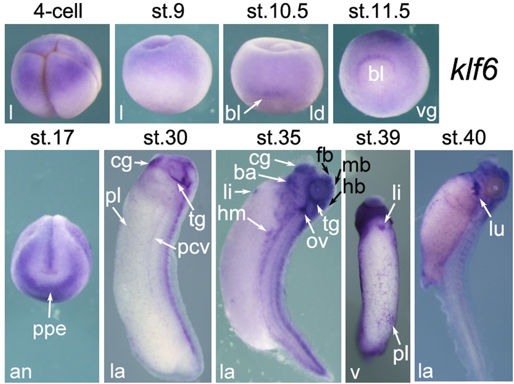 Fig. 2. C: Spatial expression patterns klf6, during Xenopus embryogenesis detected with whole mount in situ hybridization. a, animal view; aa, aortic arches; ad, adenohypophysial placode; an, anterior view, dorsal is up; ba, branchial arches; bl, blastopore lip; cg, cement gland; d, dorsal view, the anterior is up; da, dorsal anterior view; dv, dorsal vegetal view; ey, eye; fb, forebrain; fep, facial epibranchial placode; hb, hindbrain; he, heart anlage; hg, hatching gland; hm, hypaxial muscles; is, intersomitic ves- sels; l, lateral view, the animal pole is up; la, lateral view, the anterior is up and the ventral is to the left; ld, lateral dorsal view, the animal pole is up; le, lens; li, liver primordium; lu, lung primordium; mb, midbrain; nc, neural crest; np, neural plate; op, olfactory placode; ov, otic vesicle; pcv, posterior cardinal vein; pl, plexus; pn, pronephros; pop, presumptive olfactory placode; ppe, preplacodal ectoderm; prp, preplacodal region; pt, proctodeum; sd, primordia of stomach/duodenum; sm, somite; tg, trigeminal placode; v, ventral view, the anterior is up; vbi, ventral blood island; vg, vegetal view, the dorsal is up. This image is extracted from figure published in: Gao Y et al. (2015), Image published in: Gao Y et al. (2015) Copyright © 2015. Image reproduced with permission of the Publisher, John Wiley & Sons.