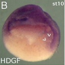 hdgf (hepatoma-derived growth factor) gene expression in bisected Xenopus laevis embryo, mid-sagittal section, assayed via in situ hybridization, NF stage 10.5, dorsal right, animal hemisphere up.