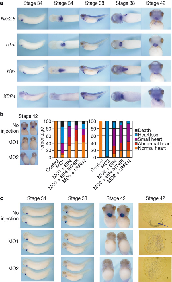 FIGURE 4. IGFBP-4 is required for the maturation of the heart in Xenopus embryos. a, In situ hybridization analysis of Nkx2.5 (an early cardiac marker), cTnI (a mature cardiac marker), Hex (a liver marker), and XIGFBP-4 (XBP4) mRNA expression at stages 34, 38 and 42. b, Knockdown of XIGFBP-4 by two different morpholinos (MO1 and MO2) resulted in severe cardiac defects as assessed by cTnIin situ hybridization at stage 42 (left). These cardiac defects were rescued by simultaneous injection of MO-resistant wild-type XIGFBP-4, mutant XIGFBP-4-H74P (BP4(H74P) and LRP6N (n = 30 for each group). c, Temporal profile of cardiac defects induced by XIGFBP-4 knockdown. Morphology of the heart as assessed by cTnI in situ hybridization was almost normal at stage 34 but was severely perturbed at stages 38 and 42. The right column shows sections of control and MO-injected embryos. The arrow indicates the heart in control embryos. No heart-like structure was observed in MO-injected embryos. Image published in: Zhu W et al. (2008) Copyright © 2008. Image reproduced with permission of the Publisher, Macmillan Publishers Ltd.