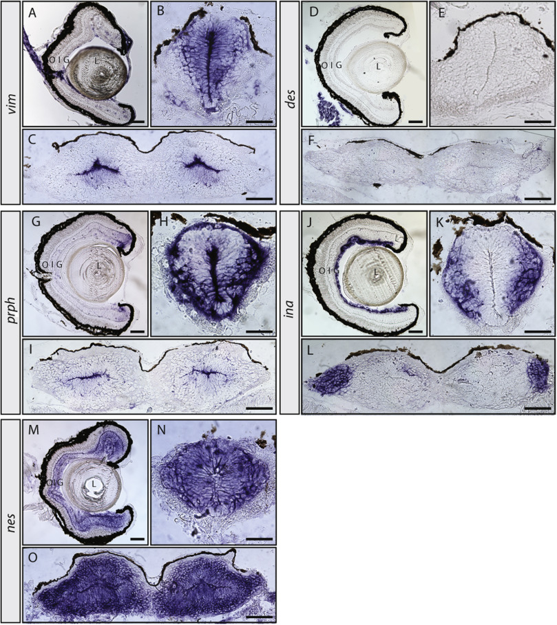 Fig. 5. Expression patterns of vim, des, prph, ina, and nes in the pre-metamorphic tadpole nervous system. In situ hybridization on retinal, brain and spinal cord sections for vim (AâC), des (DâF), prph (G-I), ina (JâL), and nes (MâO). Sections were obtained from pre-metamorphic stage 50 tadpoles. Location of the lens (L), outer (O), inner (I) and ganglion (G) cell layers are indicated. Scale bars, 100 µm in A, D, G, J and M; all others are 50 µm.