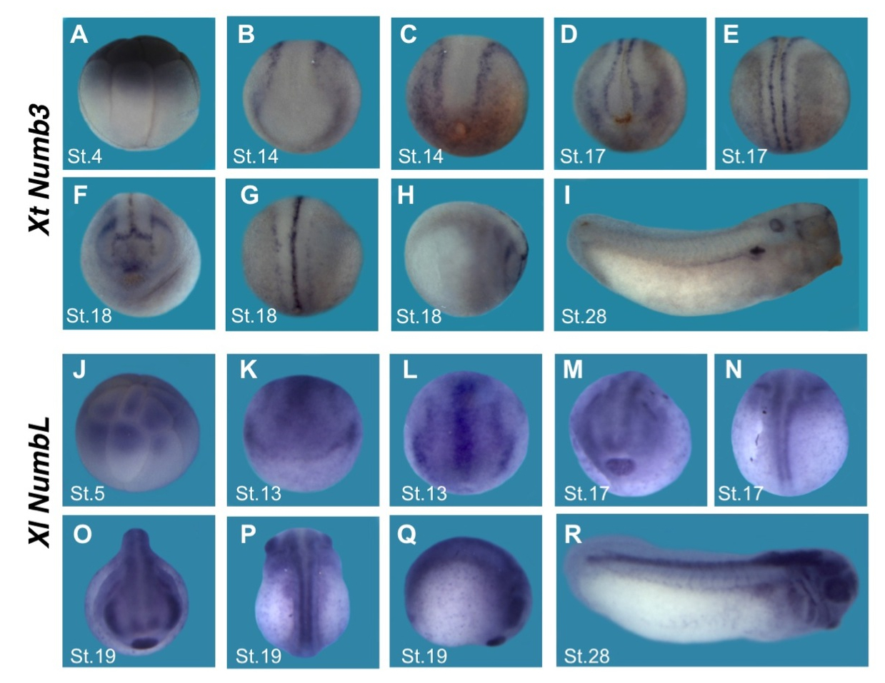 Figure S5: Comparative whole mount in situ expression analysis of staged X. tropicalis embryos using an antisense X. tropicalis Numb3 RNA probe (A-I) or a antisense X. laevis NumbL RNA probe (J-R). The embryos in A, H, I, J, Q, and R are shown in a lateral view; in B, D, F, K, M and O in an anterior view; in C, E, G, L, N and P in a dorsal view. The expressions patterns obtained are highly correlative with those shown Figure 1 using X. laevis embryos demonstrating cross-species probe hybridization of Numb3 and NumbL and their conservation in expression. Image published in: Nieber F et al. (2013) Copyright © 2013 Nieber et al. Creative Commons Attribution license