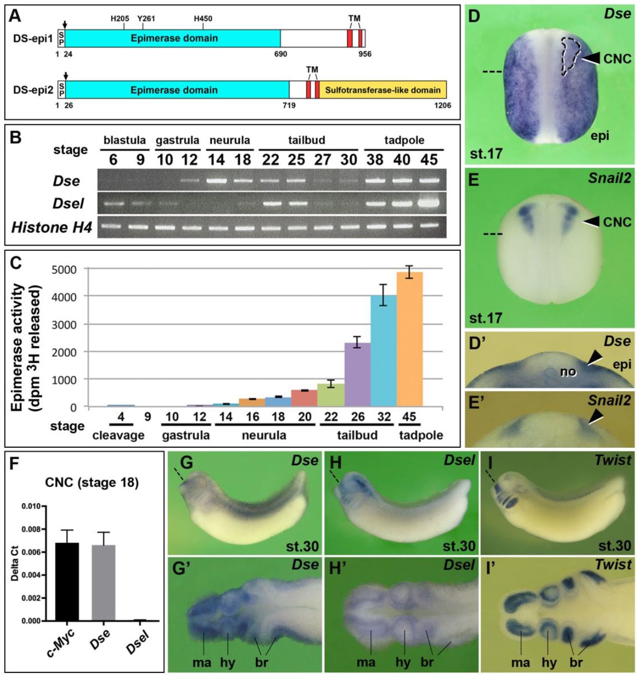 expression domain. (F) qPCR analysis in CNC explants at stage 18. c-Myc was used as a CNC cell marker. Note that Dse but not Dsel mRNA is be detected. Mean ±SDEV from triplicates. Number of biological replicates n=4. (G-Iâ) Tailbud embryos in the lateral view (G-I) and horizontal section (Gâ-Iâ). Note that Dse and Dsel overlap with Twist expression in migrating CNC cells. Section planes are indicated with dashed straight lines. br, branchial arch segments; CNC, cranial neural crest; epi, epidermis; hy, hyoid segment; ma, mandibular segment; no, notochord; SP, signal peptide; TM, transmembrane domains. Image published in: Gouignard N et al. (2016) © 2016. Creative Commons Attribution license
