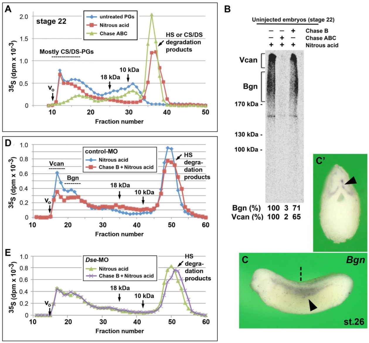 (D,E) Chase B treatment degrades CS/DS chains in high molecular weight-PGs in control-MO- (D) but not Dse-MO-injected embryos (E).