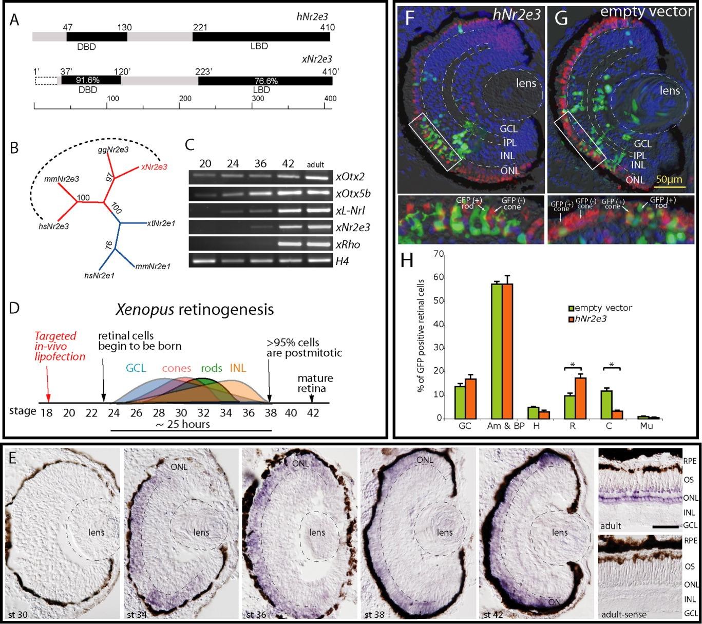 Figure 1. Xenopus Nr2e3 gene is highly conserved with other vertebrates. A: Comparison of human Nr2e3 with Xenopus Nr2e3. The sequence identities of DNA binding domains (DBD) and ligand binding domains (LBD) were revealed by using DNAStar (Stratagene). Numbers in the bars show the percentage of amino acid (AA) sequence identity to hNr2e3. The numbers above the bar indicate the boundaries of different regions based on AA residue position. Xenopus AA residue positions are relative due to the fact that exon 1 is missing. The dashed line represents the unidentified sequence. B: Phylogenetic relationship of Nr2e3 and Nr2e1 family members. Maximum parsimony algorithm with bootstraping was used to determine relationships. Species abbreviations are as follows: hs, Homo sapiens; mm, Mus musculus; xl, Xenopus laevis; gg, Gallus gallus. C: Reverse transcriptase-polymerase chain reaction (RT-PCR) of adult Xenopus heads (stages 20, 24, 36), eyes (stage 42). and retina (adult) RNA using xOtx2, xOtx5b, xL-Nrl, xNr2e3, xRho, and H4 (loading control) primers. D: Timing of Xenopus retinogenesis. E: In situ hybridizations of Xenopus laevis retina at different stages with xNr2e3 probe. Staining can be seen in the outer nuclear layer of the photoreceptors only when antisense probe is used. The negative control (using sense probe) does not produce any staining. Scale bar is 50 mu m. F,G: Embryos at stage 17-18 were lipofected in eye anlagen with either CMV-empty vector (F) or CMV-hNr2e3 together with CMV-GFP (G) and immunostained with cone antibody (anti-calbindin) and DAPI. Cones appear red (untransfected) or yellow (transfected), while rods always appear green (F,G lower panels). The fates of lipofected cells were determined and quantified as the average percentage of each cell type. H: Student's t-test was used to determine significance. Asterisks denote P < 0.05. GC, ganglion; Am&BP, amacrine and bipolar, H, horizontal; R, rod; C, cone; Mu, Müller glia; RPE, retina pigment epithelia; OS, outer segment; ONL, outer nuclear layer; INL inner nuclear layer; IPL inner plexiform layer; GCL, ganglion cell layer. Image published in: McIlvain VA and Knox BE (2007) Copyright © 2007. Image reproduced with permission of the Publisher, John Wiley & Sons.
