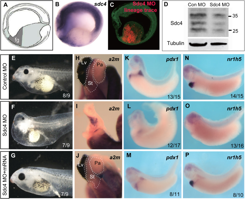 Fig. 1. Sdc4 is required for foregut organogenesis (A) Schematic of a NF19 stage Xenopus embryo in mid-sagittal section with the foregut (fg) endoderm shown in dark grey and mid/hindgut endoderm in light grey. (B) In situ hybridization showing sdc4 expression at stage NF19. (C) Confocal image showing Alexa lineage tracer (red) in a bisected stage NF19 embryo confirming the targeted microinjection of the foregut endoderm. (D) Western blot analysis of NF19 dissected foreguts confirming Sdc4 depletion by Sdc4-MO injection. (EâG) Lateral view of stage 45 embryos showing foregut hypoplasia in Sdc4-depleted embryos that is rescued by sdc4 mRNA injection. (HâJ) In situ hybridization of a2m in isolated stage 45 gut tube showing hypoplastic liver (lv), stomach (st) and pancreas (p). (KâP) In situ hybridization with liver (nr1h5) and pancreas/duodenum (pdx1) markers at stage NF35 showing defects in organ specification, which are rescued by sdc4 RNA injection. In all panels, numbers indicate the embryos exhibiting the phenotype. Image published in: Zhang Z et al. (2016) Image reproduced on Xenbase with permission of the publisher and the copyright holder. Creative Commons Attribution-NonCommercial-NoDerivatives license