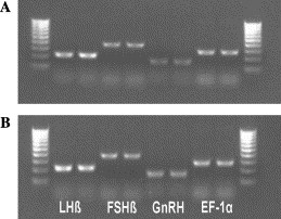 PCR products of luteinizing hormone β-subunit (LHβ), follicle stimulating hormone β-subunit (FSHβ), gonadotropin releasing hormone (GnRH) and elongation factor 1-α (EF-1α) from brainâpituitary samples of male (A) and female (B) X. laevis are shown on an agarose gel. Duplicate determinations of LHβ, FSHβ, GnRH, and EF-1α demonstrate-specific product lengths of 218, 391, 163, and 285 bp, respectively. The molecular weight marker indicates distances of 100 bp DNA. Image published in: Urbatzka R et al. (2006) Copyright © 2006. Image reproduced with permission of the Publisher. Larger Image Printer Friendly View |