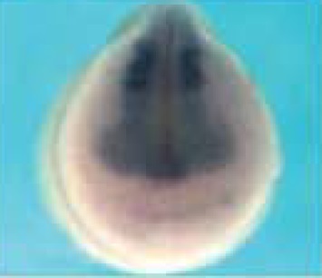 rab11fip4 (RAB11 family interacting protein 4 (class II)) gene expression in Xenopus laevis embryo, assayed via in situ hybridization, NF stage 19, anterior view, dorsal up. This image is extracted from figure published in: Giudetti G et al. (2014), Image published in: Giudetti G et al. (2014) Copyright © 2014. Image reproduced with permission of the Publisher, John Wiley & Sons.