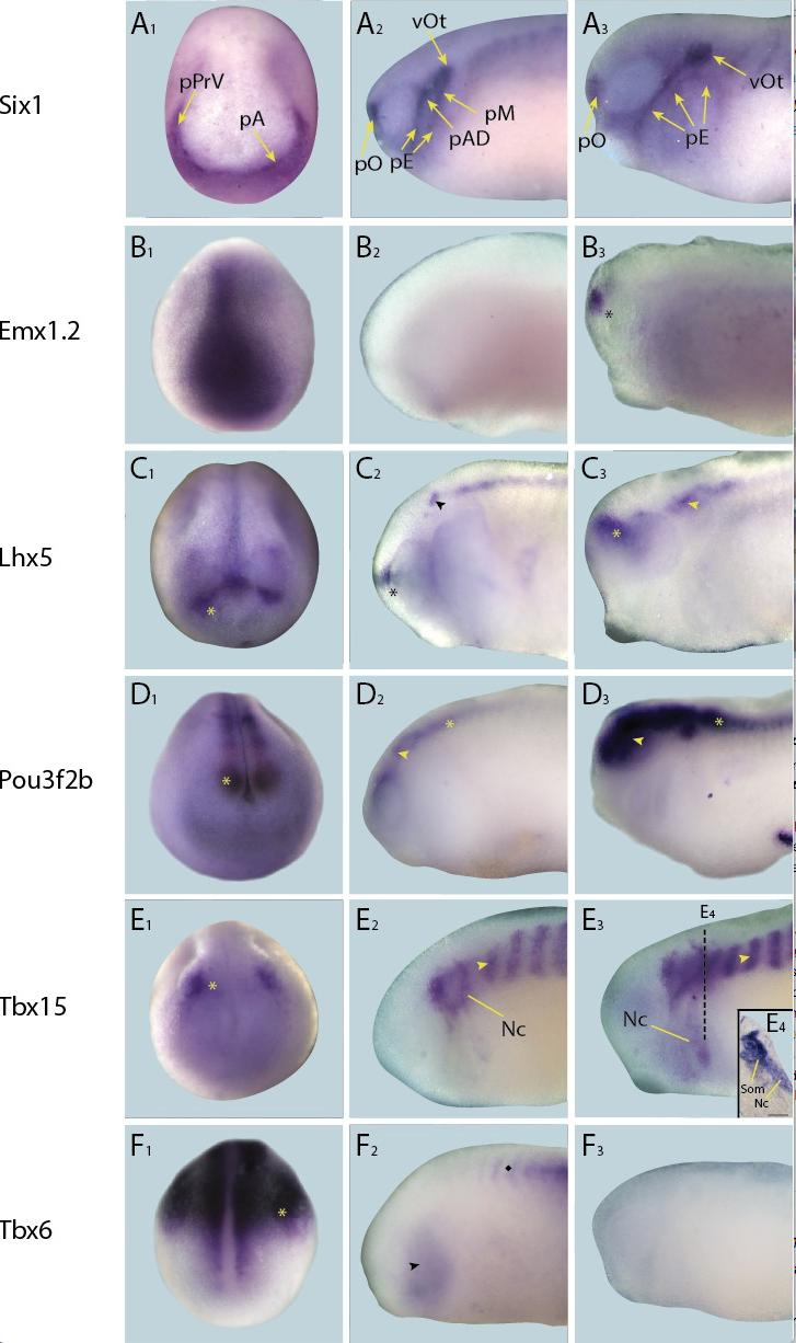 Expression dynamics for each target are shown across a range of developmental stages: A1âF1 show expression in neural plate stage embryos, A2âF2 show early tail bud stage embryos and A3âF3 show late tail bud stage embryos. (A) Expression of PPE marker gene Six1 is shown as reference for placodal domains (for details see Pandur and Moody, 2000; Schlosser and Ahrens, 2004). (B) Emx1.2 is expressed broadly in the neural plate in neural plate stages (B1), and becomes restricted to the forebrain in late tail bud stages (B3; asterisk). (C) Lhx5 is expressed in the forebrain at all developmental stages (C1âC3; asterisk), and at early and late tail bud stages Lhx5 is also expressed in the hindbrain and spinal cord (C3; arrowhead). (D) Pou3f2b is expressed in the neural plate and developing neural tube (D1; asterisk) at neural plate stages. Expression in the brain and spinal cord is maintained during early and late tail bud stages (D2 and D3 ; arrowhead and asterisk, respectively). (E) Tbx15 is expressed in a restricted domain of the anterolateral neural folds in neural plate stages (E1; asterisk). At tail bud stages expression is prominent in somites (E2 and E3; arrowhead) and migrating neural crest cells of the hyoid and first branchial neural crest streams (Nc). Both of these expression domains are maintained into late tail bud stages (E3 and E4). E4 shows section at the level indicated in E3 (dotted line). Bar in E4: 100 μm. (F) Throughout all developmental stages (F1âF3) Tbx6 is expressed strongly in the posterior paraxial and lateral plate mesoderm (F1 and F2; asterisk) with weaker expression in the pharyngeal arches (F2; arrowhead). Subsequently, itâs expressed in somites, as indicated by a diamond in F2. Abbreviations: pA: anterior placodal region; pAD: anterior lateral line placode; pE: epibranchial placode; pM: middle lateral line placode; pO: olfactory placode; vOt: otic vesicle; pPrV: profundal/trigeminal placodes. Image published in: Riddiford N and Schlosser G (2016) © 2016, Riddiford et al. Creative Commons Attribution license