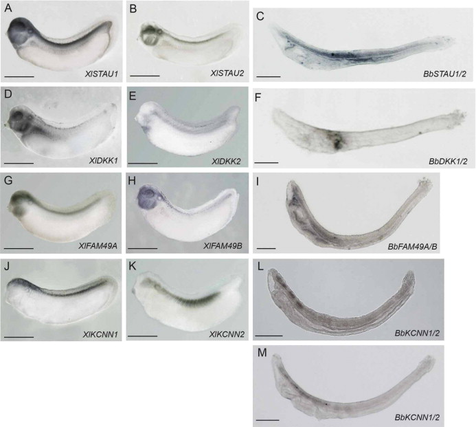 Expression patterns of four conserved expressed gene families: STAU (A–C), FAM49 (D–F), KCNN (G–I) and DKK(J–M). L, M: amphioxus larvae at 24 h and 36 h post-fertilization. Scale bars: 1 mm (A, B, D, E, G, H, J, K); 100 μm (C, F, I, L, M).