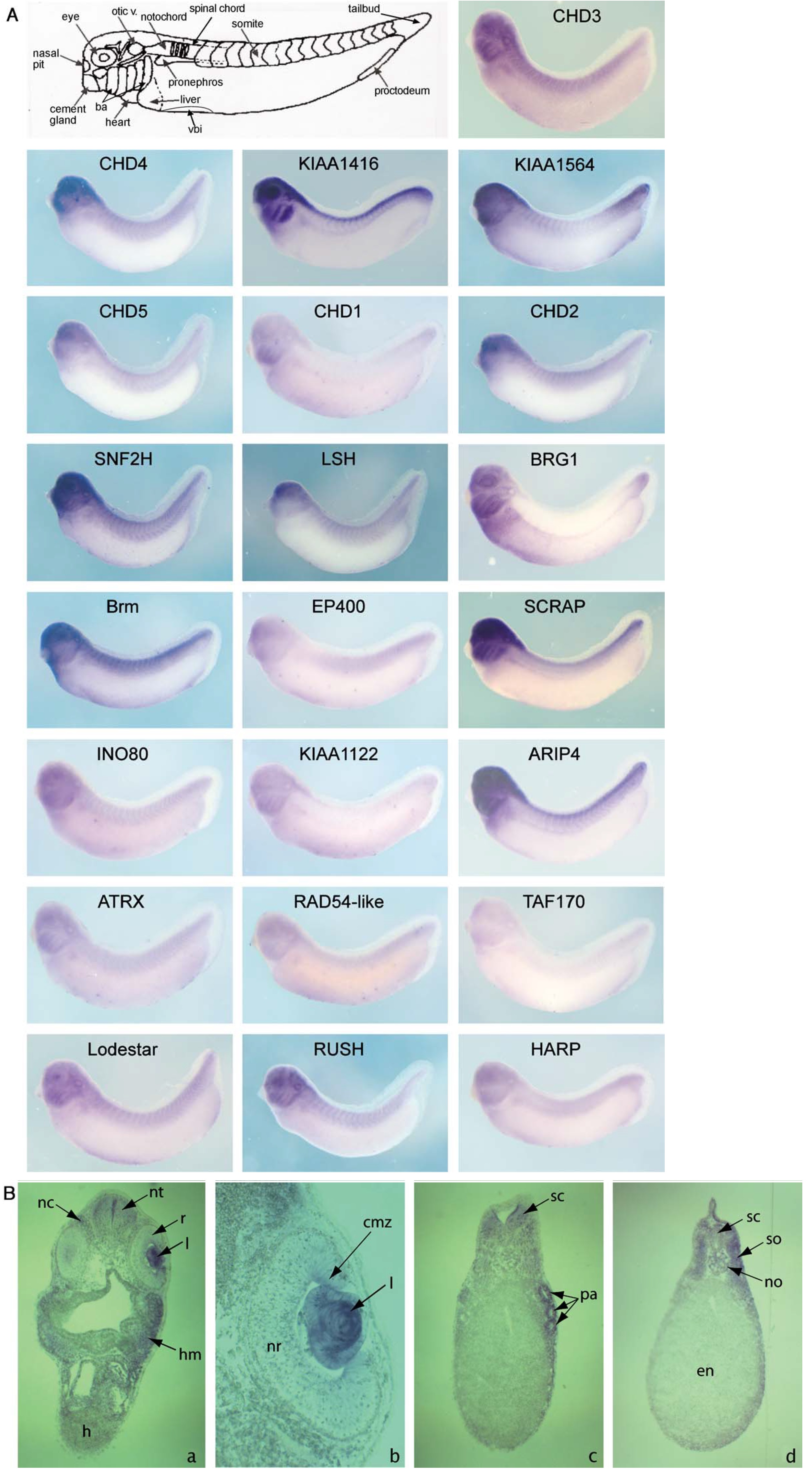 | chd4.L | LOC108697348, Mi-2, Mi2B, Mi2beta | X. laevis | Sometime during NF stage 28 to NF stage 35 and 36 | otic vesicle brain forebrain midbrain somite pharyngeal arch eye