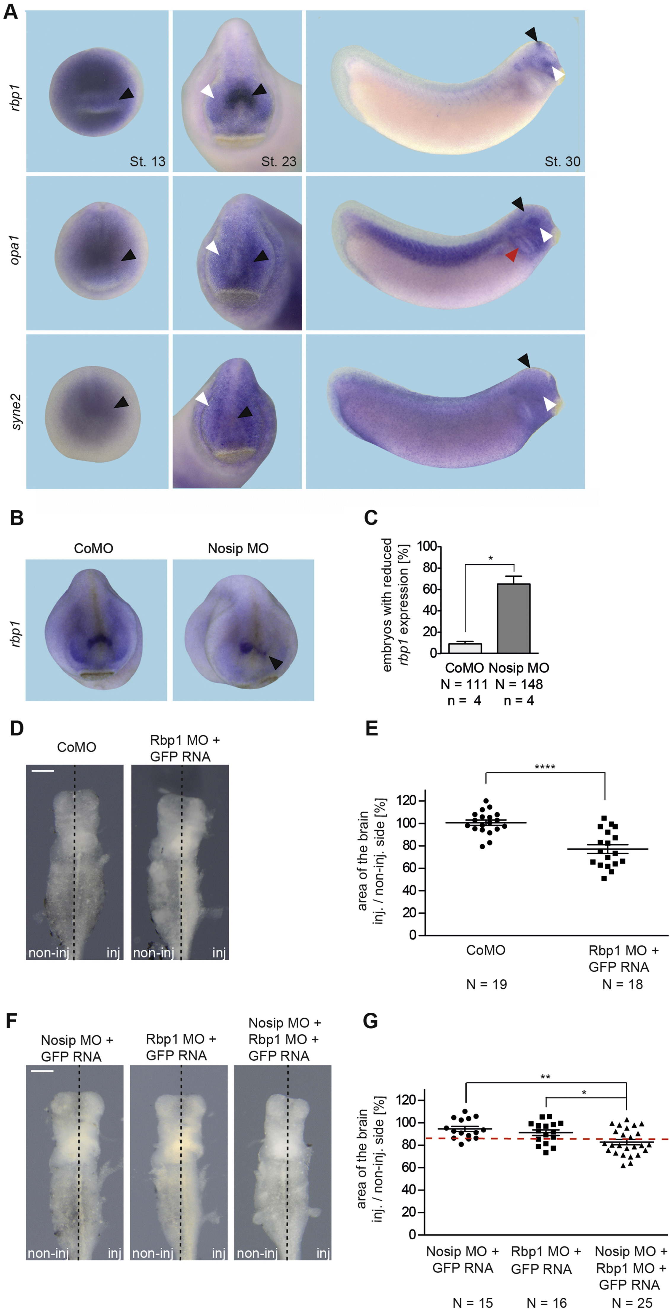 Nosip and Rbp1 act synergistically duringXenopusbrain development (A)rbp1-, opa1- and syne2-specific WMISH of Xenopus embryos at indicated stages; black arrowheads pointing to anterior neural plate at stage 13 and brain at stages 23 and 30, white arrowhead pointing to the eye, red arrowhead to pharyngeal arches (B)rbp1-specific WMISH of Xenopus embryos at stage 23 after unilateral injection of Nosip MO or Control MO as indicated; injected side at the right, arrowhead pointing to reduced rbp1 expression in the brain (C) Statistical evaluation of the data shown in B (D) Bright field images of Xenopus brains at stage 42, anterior to the top, after unilateral injection of Rbp1 MO or Control MO and GFP mRNA as indicated; scale bar 200 µm (E) Statistical evaluation of the data shown in D, N = number of independently evaluated brains (F) Synergy experiment. Bright field images of Xenopus brains at stage 42, after unilateral injection of either 10 ng Nosip MO or 30 ng Rbp1 MO alone or in combination. 0.5 ng GFP mRNA was co-injected as lineage tracer; scale bar 200 µm (G) Statistical evaluation of the data shown in F, N = number of independently evaluated brains. Image published in: Hoffmeister M et al. (2017) Copyright © 2017. Image reproduced with permission of the Publisher, Elsevier B. V.