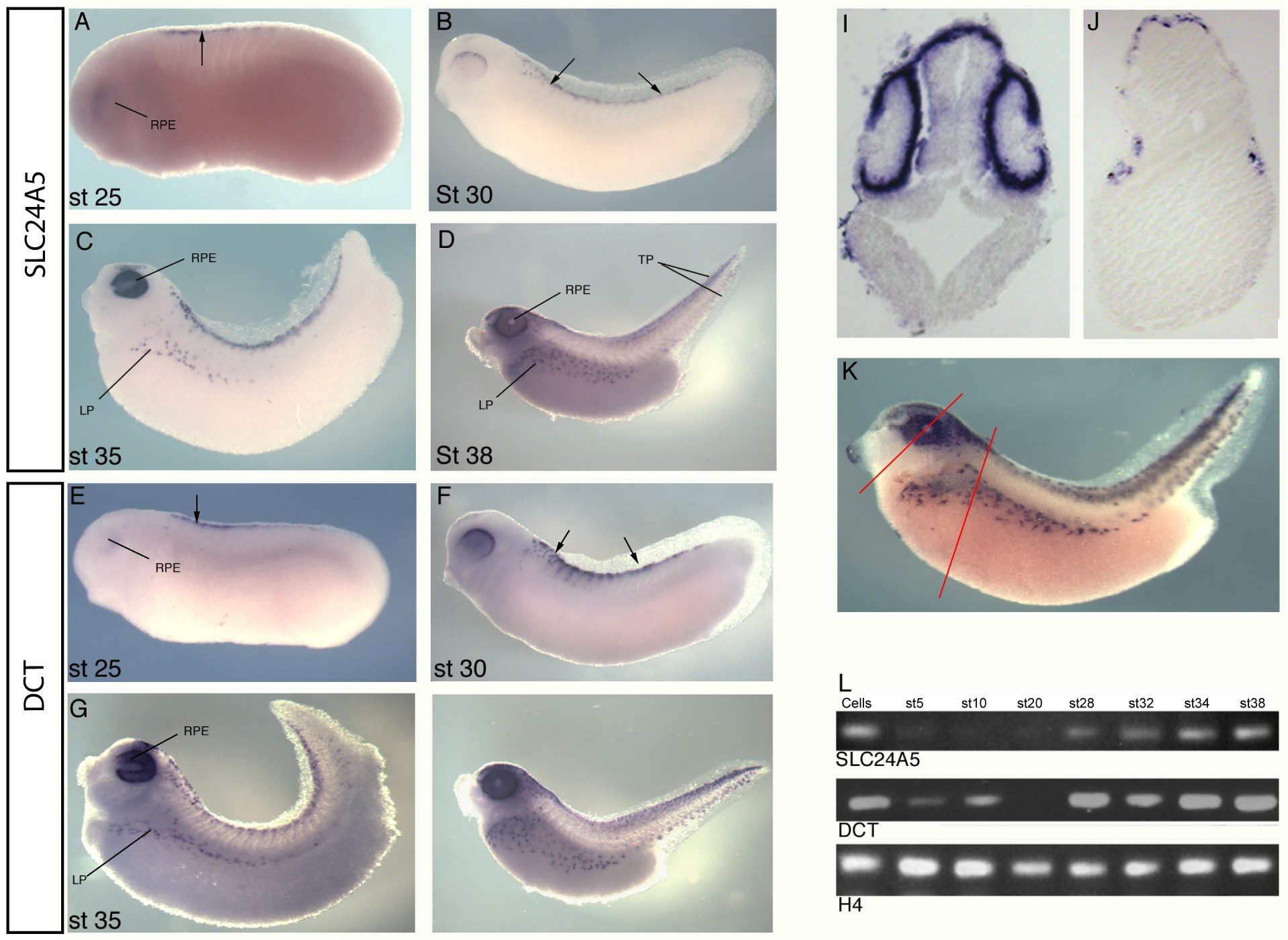 (A-K) Whole mount in situ hybridisation, (L) RT-PCR. (A-D) Expression of SLC24A5. (A) Expression initiates in the neural crest (arrow) and RPE at stage 25. (B) Expression continues in the melanophores as they mature from the neural crest as indicated by arrows. (C) Expression continues in the melanophores in the lateral pigmentation (LP) and increases in the RPE. (D) By stage 38 strong expression can be seen in melanophores of the lateral pigmentation, tail pigmentation (TP) and RPE. (E-H) Expression of the melanophore marker DCT in X.laevis. (E) Expression in the arising neural crest is indicated by arrow, (F) DCT is expressed in the melanophores as they mature from the neural crest as indicated by arrows. (G) and (H) Expression is maintained as melanophores migrate into lateral and tail pigmentation, expression continues in the RPE of the eye as indicated. (I-K) Histological analysis of SLC24A5 expression. (I) Section through the head reveals restricted expression to the RPE and dorsal head. (J) Section through the trunk shows expression in the flanks of the tadpole trunk and head. (K) whole embryo before sectioning, red line indicate approximate area where above sections were taken. (L) RT PCR analysis of SLC24A5 from various stages of X.laevis development. DCT was used a melanophores marker comparison, H4, loading control. Cells used were X.laevis melanophores (kind gift from Vladimir Gelfand).