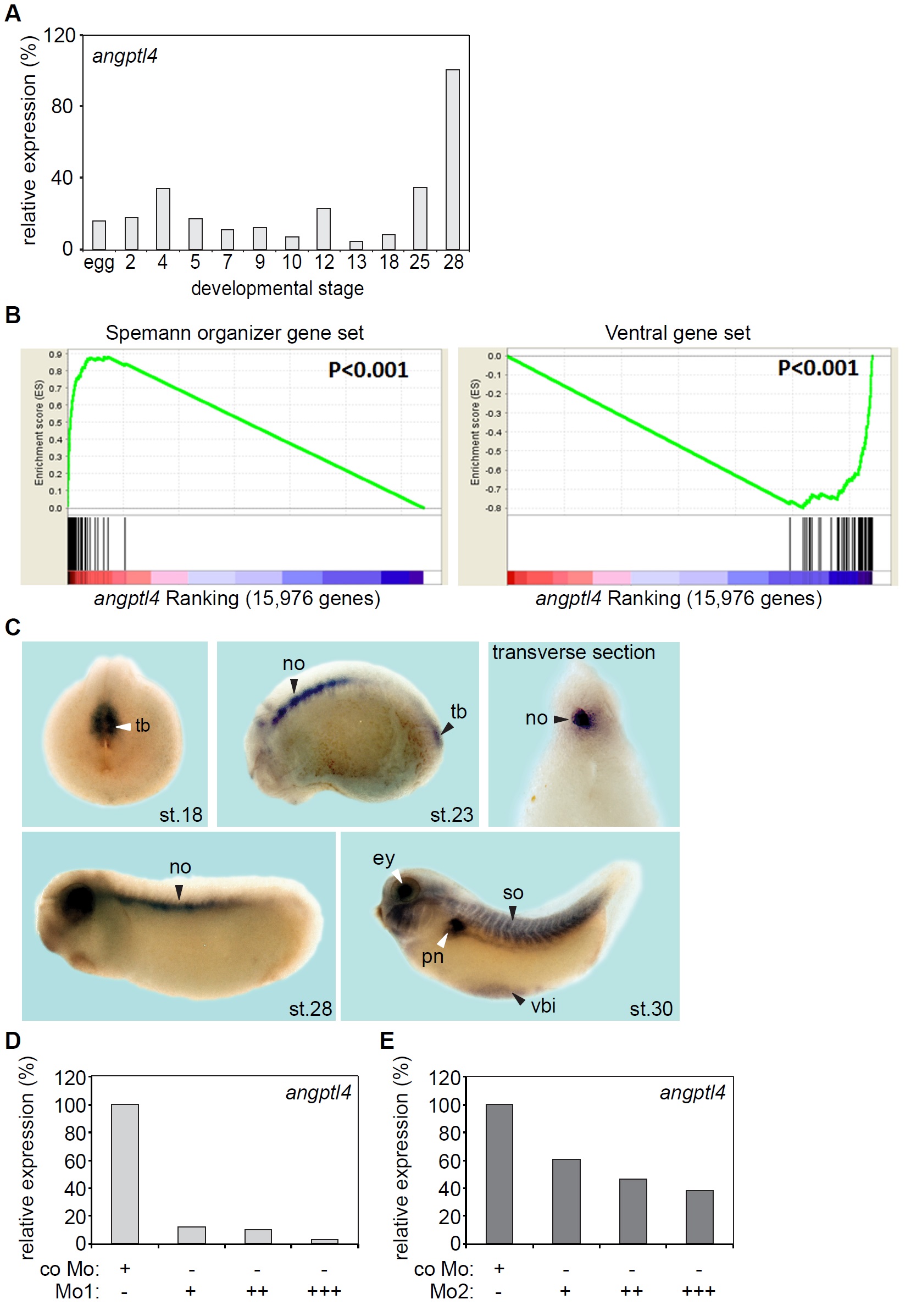 (C) Whole-mount in situ hybridization of angptl4 mRNA in X. tropicalis embryos at the indicated stages. Tb, tailbud mesoderm; no, notochord; ey, eye; pn, pronephros; so, somites; vbi, ventral blood island.