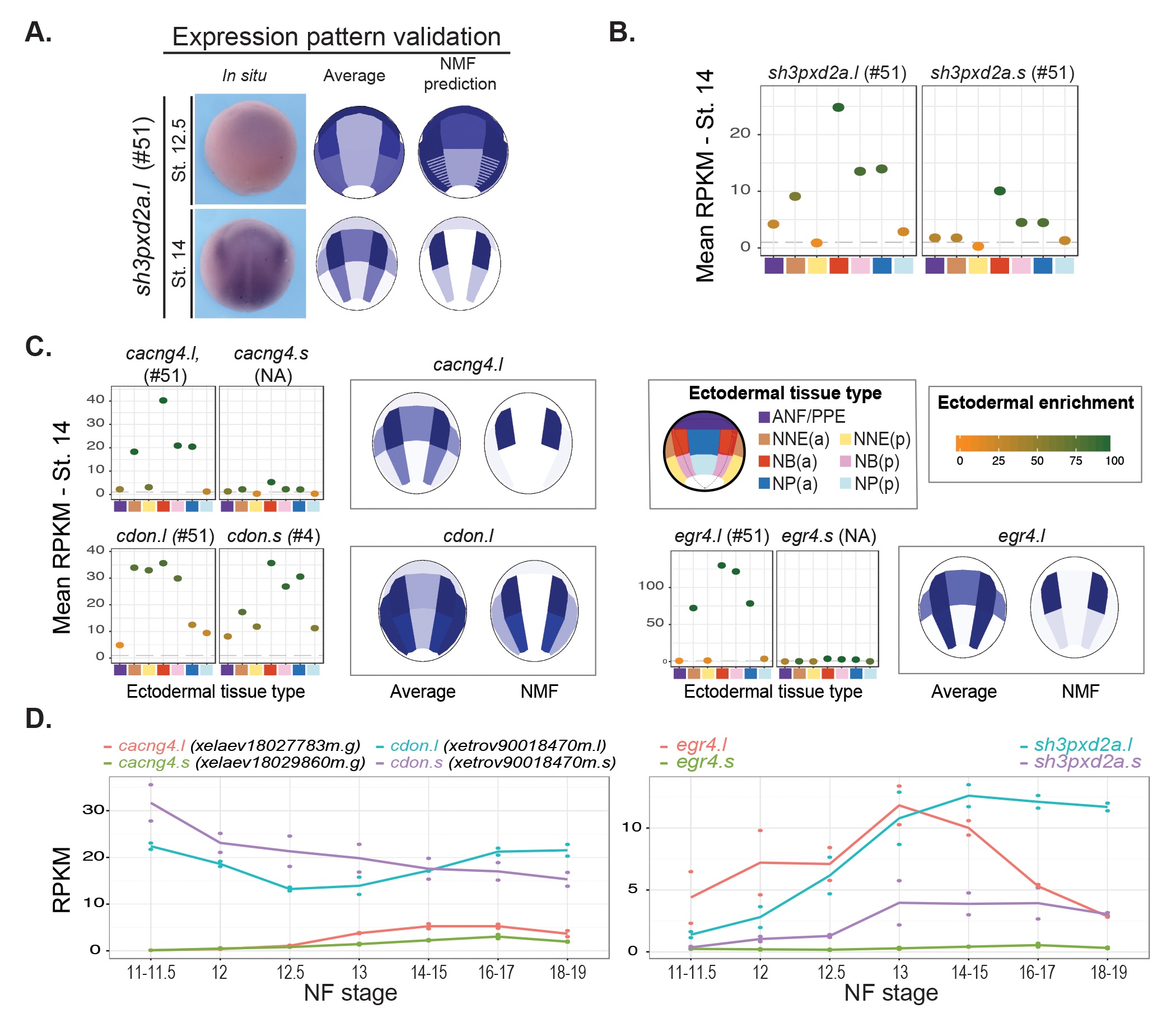 Fig 7. Genes with predicted expression and functional association to the neural crest (NC). (A) Validation of the expression pattern of sh3pxd2a at Nieuwkoop and Faber stages (St.) 12.5 and St. 14. Upon prediction of NC expression by nonnegative matrix factorization (NMF), we cloned a probe for novel gene sh3pxd2a and analyzed its in vivo pattern: while expressed at very low levels (B, 25 reads per kilobase per million [RPKM] in the anterior neural plate border [NBa] St. 14), it was readily detected, at low level, in the prospective NC in vivo. (B) Average RPKM expression per tissue dissection highlighting sh3pxd2a ectodermal enrichment in the NBa. Expression level for each homeologous gene copy is indicated. (C) Expression pattern predictions for 2 novel genes grouped in G-51, a group associated with NC development: cacng, cdon. Egr4 was recently shown expressed in cranial NC [35]. Mean expression of both homeologous copies is indicated for each dissected region. (D) Temporal expression during neurulation (mean expression levels in whole embryos) for each homeologous copy of cacng4, cdon, and egr4. See S11 Table for numerical data. Image published in: Plouhinec JL et al. (2017) © 2017 Plouhinec et al. Creative Commons Attribution license