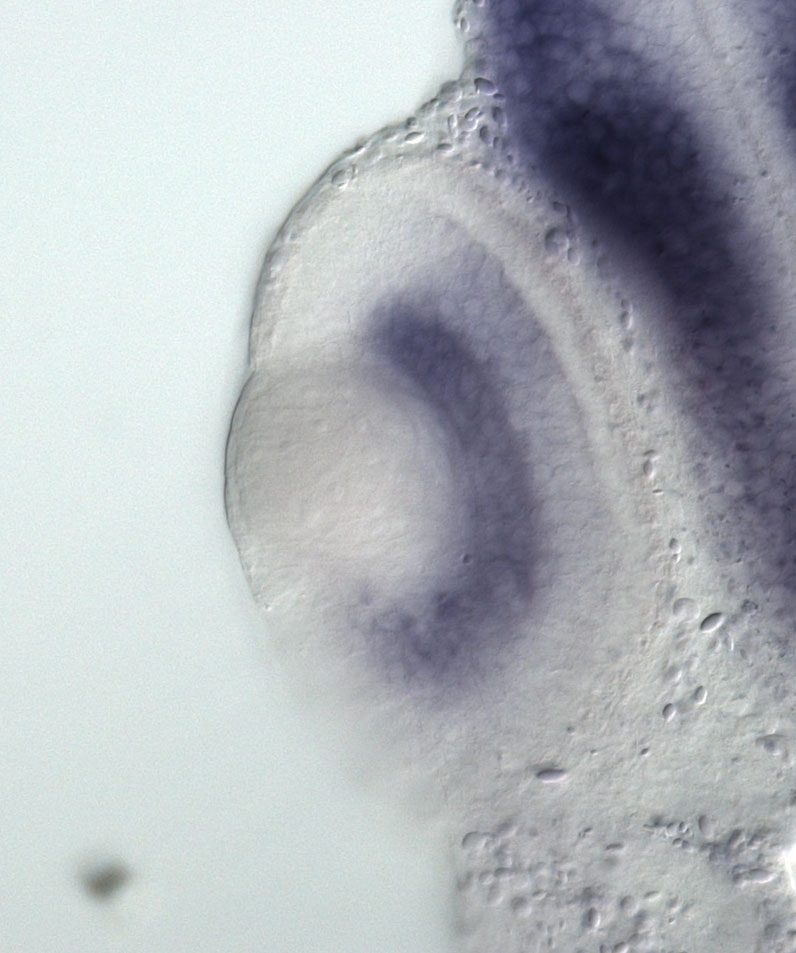 mapre3 (microtubule associated protein RP/EB family member 3 L homeolog) gene expression in sectioned eye of X. laevis embryo, assayed via in situ hybridization, NF stage 39-40, lens epithelium and anterior left, dorsal up. Copyright © Perron Lab