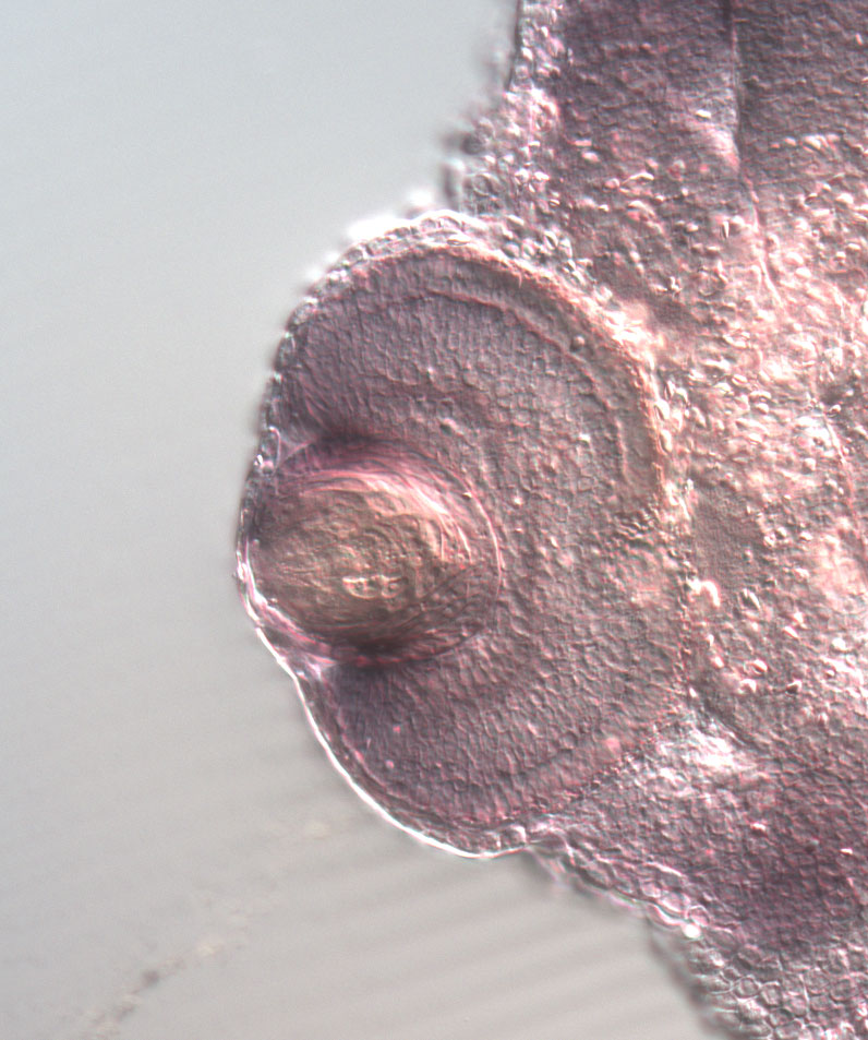 dpm3 (dolichyl-phosphate mannosyltransferase polypeptide 3) gene expression in sectioned eye of X. laevis embryo, assayed via in situ hybridization, NF stage 39-40, lens epithelium and anterior left, dorsal up. Copyright © Perron Lab