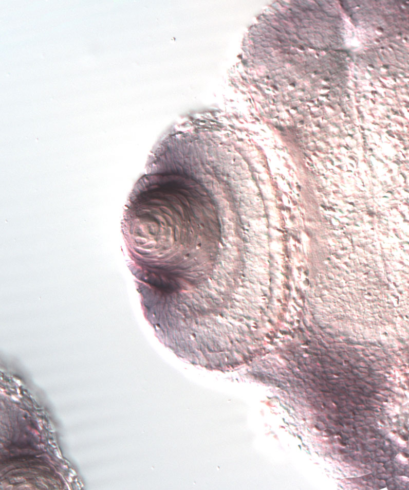 lpin2 (lipin 2 L homeolog) gene expression in sectioned eye of X. laevis embryo, assayed via in situ hybridization, NF stage 39-40, lens epithelium and anterior left, dorsal up. Copyright © Perron Lab