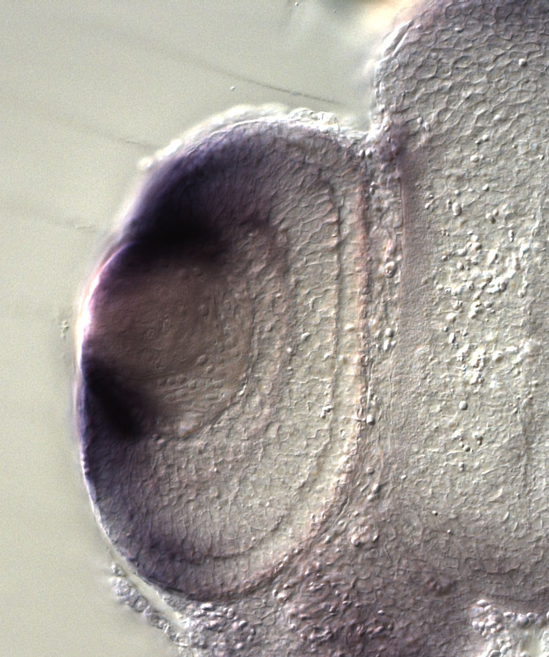 eef2 (eukaryotic translation elongation factor 2, gene 1) gene expression in sectioned eye of X. laevis embryo, assayed via in situ hybridization, NF stage 39-40, lens epithelium and anterior left, dorsal up. Copyright © Perron Lab
