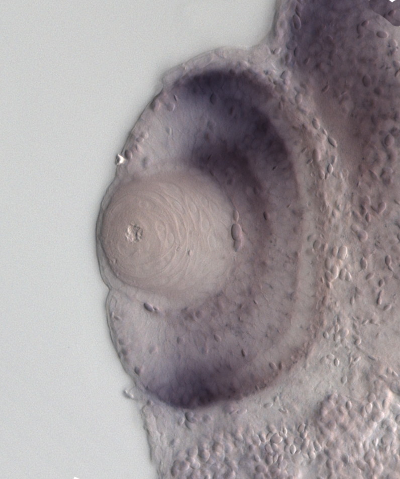 lnx1 (ligand of numb-protein X 1 L homeolog) gene expression in sectioned eye of X. laevis embryo, assayed via in situ hybridization, NF stage 39-40, lens epithelium and anterior left, dorsal up. Copyright © Perron Lab