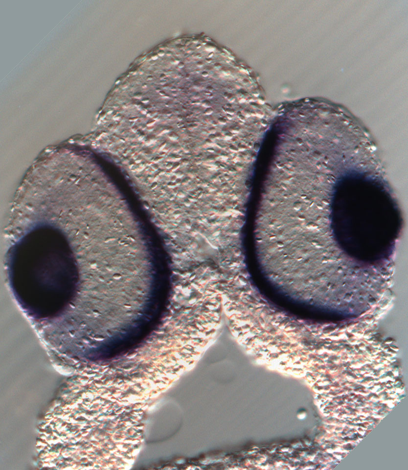 pmp2 (peripheral myelin protein 2) gene expression in sectioned head of X. laevis embryo, assayed via in situ hybridization, NF stage 39-40, anterior up. Copyright © Perron Lab