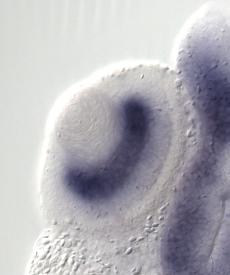 pptc7 (PTC7 protein phosphatase homolog) gene expression in sectioned eye of X. laevis embryo, assayed via in situ hybridization, NF stage 39-40, lens epithelium and anterior left, dorsal up. Copyright © Perron Lab