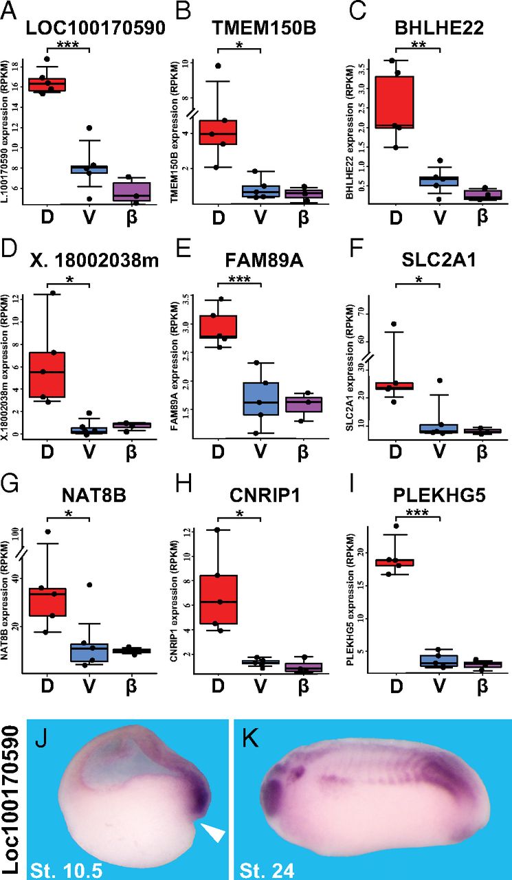 Fig. 3. The early β-catenin signature contains previously undescribed dorsal transcripts. (AâI) Box plots indicate dorsal and ventral gene expression levels (in RPKM) in five independent regenerating half-embryo experiments. These genes have either not been previously characterized or have been only superficially investigated. Box plots illustrate the reproducibility of replicate experiments. Each dot represents the expression in RPKM of the corresponding gene in a distinct experiment. Genes above the whisker are considered outliers according to the interquartile range (IQR) calculated for each box plot. The difference between dorsal and ventral expression was statistically significant for all nine genes, with all genes surpassing the 95% confidence interval mark at a minimum. The β-CatMO RPKMs (β) were similar to those of ventral halves. Statistical significance was determined through two-tailed pairwise P values. Significant differences in expression values (RPKM) are indicated as *â¤0.05, **â¤0.01, and ***â¤0.005. (J) In situ hybridization validating that unknown Loc100170590 is indeed expressed in Spemann organizer mesoderm at gastrula. White arrowhead indicates the dorsal blastopore lip. (Magnification: 16Ã.) (K) At tailbud stage 24, Loc1001170590 is expressed in eye, central nervous system, somites, and proctodeum. (Magnification: 14Ã.) D, dorsal; St., stage; V, ventral. Image published in: Ding Y et al. (2017) Copyright © 2017. Image reproduced with permission of the Publisher and the copyright holder. This is an Open Access article distributed under the terms of the Creative Commons Attribution License.