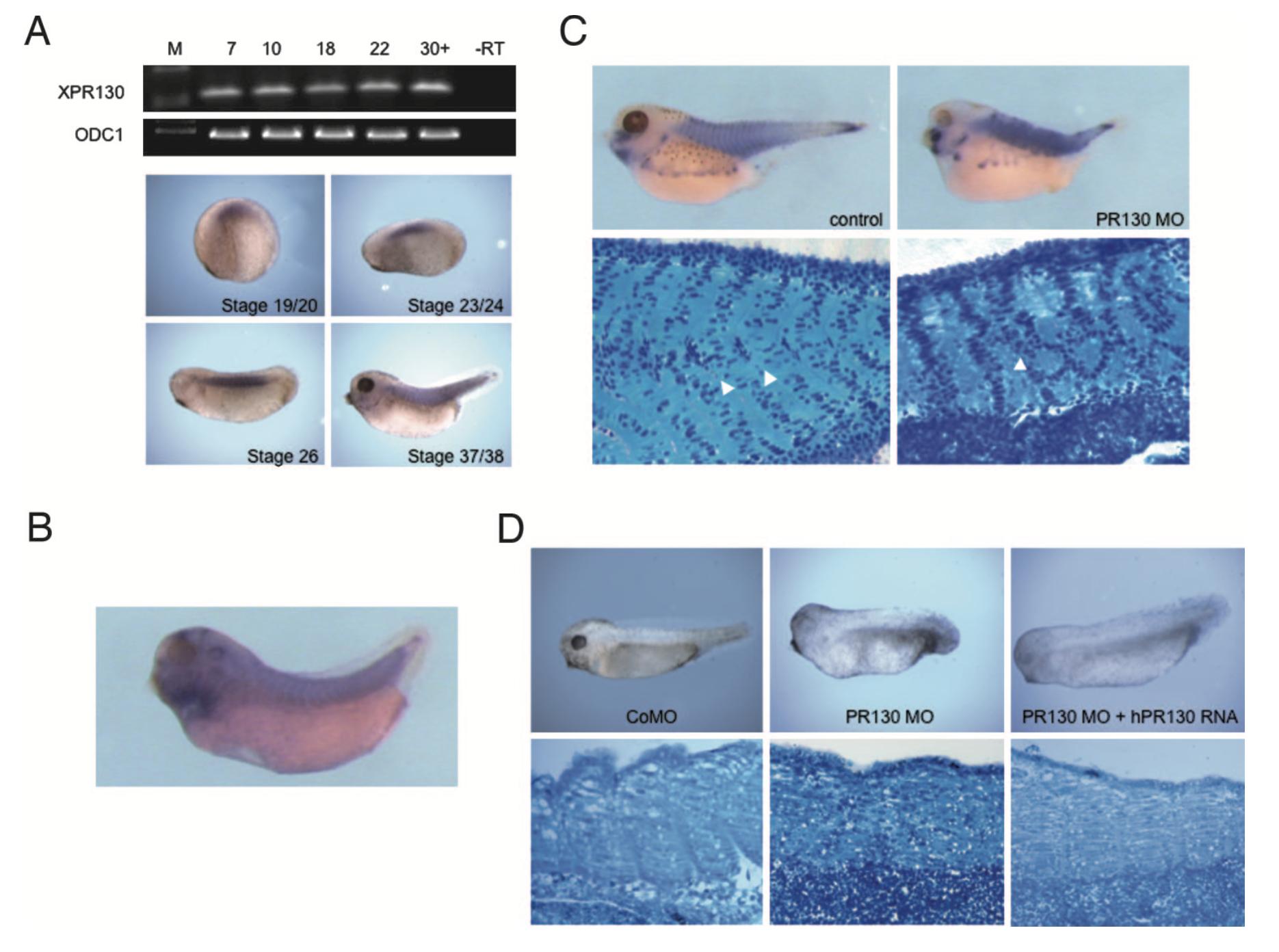 Fig. 3. PR130 depletion affects somite organization and tail development. (A) RT- PCR analysis of X. tropicalis total RNA from different developmental stages. Xpr130 is expressed maternally (stage 7) and throughout early development (stages 10, 18, 22, and 30). RT, RT-PCR without reverse transcriptase. ODC1 expression was used as loading control. (A Lower ) Whole-mount ISH for Xpr130 in embryos showing predominant staining of somites from the earliest stage detectable. (B) ISH of tailbud stage embryo with an Xnkd-specific probe. (C) Control embryo shows organized somites in a chevron-like shape as visualized by whole-mount ISH by using XmyoD as a marker (Left). PR130-depleted em- bryos lack chevron-like shaped somites (Right). Arrowheads show somitic borders. (D) Similar to B but without XmyoD. Shown are embryos injected with control MO (CoMO) (Left), PR130 MO (Center), and PR130 MO plus hPR130 RNA (Right). (Lower) Sagittal sections of the somites. Image published in: Creyghton MP et al. (2006) Copyright © 2006. Image reproduced with permission of the Publisher.
