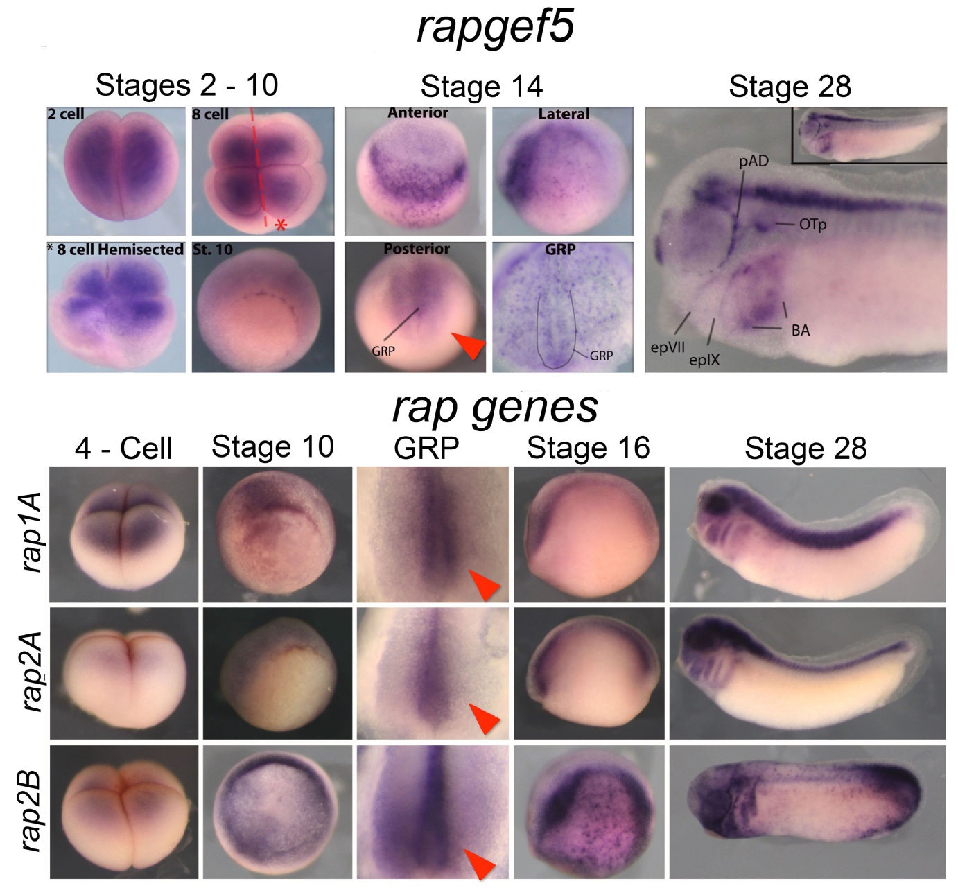 cranial placodes at stage 28. rap1A, rap2A and rap2B are all expressed in the 4 cell