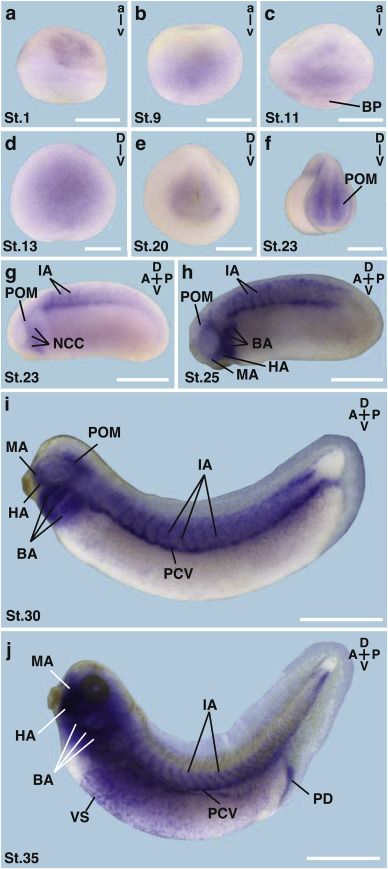 Fig. 4. Spatial expression pattern of adgra2 mRNA during Xenopus laevis embryogenesis. Spatial expression pattern of adgra2 is visualized by WMISH. Embryonic stages are indicated in each panel. a-c. Lateral views with animal to the top. d-f. Anterior views with dorsal to the top. g-j. Lateral views with anterior to the left. f, g. The first tissue specific adgra2 expression starts at stage 23 in the periocular mesenchyme (POM), the migrating neural crest cells (NCC) and the intersomitic arteries (IA). h. At stage 25, adgra2 is expressed in the periocular mesenchyme (POM), the migrating cranial neural crest cells (NCC) and the intersomitic arteries (IA). i. At stage 30, adgra2 was detected in the branchial (BA), hyoidal (HA) and mandibular (MA) arches, the periocular mesenchyme (POM), the intersomitic arteries (IA) and the posterior cardinal vein (PCV). j. At stage 35 adrga2 transcripts were detected in the pharyngeal arches (BA, HA and MA), in the intersomitic arteries (IA), the vascular system (VS), the posterior cardinal vein (PCV) and the proctodeum (PD). a, animal; A, anterior; BA, branchial arches; BP, blastoporus; D, dorsal; HA, hyoidal arch; IA, intersomitic arteries; MA, mandibular arch; NCC, neural crest cells; P, posterior; PCV, posterior cardinal vein; PD, proctodeum; POM, periocular mesenchyme; v, vegetal; V, ventral. Scale bars: 500 μm (a–h): 1 mm (i, j).