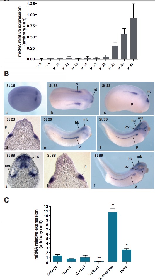 tailbud-stage embryos (stage 25). Embryos were dissected either into ventral and dorsal halves or into tail bud, pronephros and head. *: P < 0,05; **: