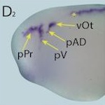 isl2 (ISL LIM homeobox 2) gene expression in Xenopus laevis embryo, assayed via in situ hybridization, NF stage 24, lateral view, anterior left, dorsal up. This image is extracted from figure published in: Riddiford N and Schlosser G (2016), Image published in: Riddiford N and Schlosser G (2016) © 2016, Riddiford et al. Creative Commons Attribution license