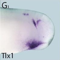 tlx1 (T cell leukemia homeobox 1) gene expression in Xenopus laevis embryo, assayed via in situ hybridization, NF stage 24, lateral view, anterior right, dorsal up. This image is extracted from figure published in: Riddiford N and Schlosser G (2016), Image published in: Riddiford N and Schlosser G (2016) © 2016, Riddiford et al. Creative Commons Attribution license