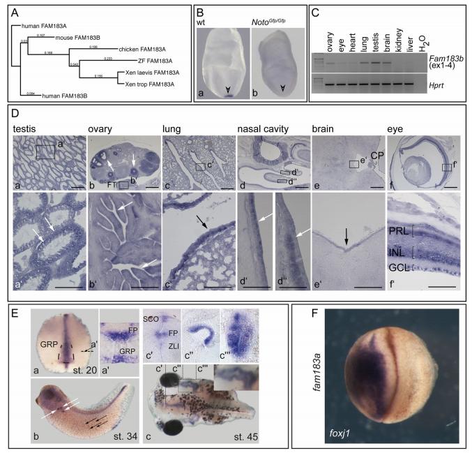 Figure 1. Expression of Fam183b. (A) Phylogram of vertebrate Fam183 genes rooted on human FAM183A.