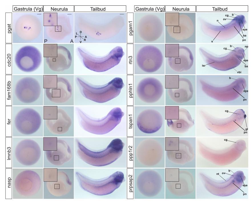 Fig. 3. WISH analysis of PGC transcripts. Expression of selected PGC-enriched mRNAs at post-MBT st. 11.5 (gastrula), 16 (neurula) and 33/34 (tailbud). pgat