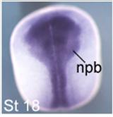 cdk9 (cyclin-dependent kinase 9) gene expression in Xenopus laevis embryo, assayed via in situ hybridization, NF stage 18, dorsal view, anterior up. This image is extracted from figure published in: Hatch VL et al. (2016), Image published in: Hatch VL et al. (2016) Copyright © 2016. Image reproduced with permission of the Publisher, Elsevier B. V.
